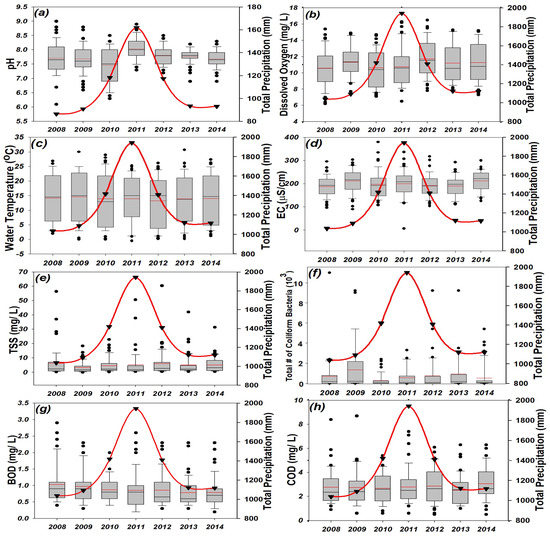 - An, K.G.; Jones, J.R. Temporal and spatial patterns in ionic salinity and suspended solids in a reservoir influenced by the Asian monsoon. Hydrobiologia 2000, 436, 179–189. [Google Scholar] [CrossRef]