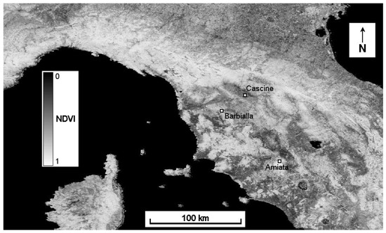 MODIS normalized difference vegetation index (NDVI) image of August 2013 showing the geographical position of the three study sites (Barbialla, Amiata, and Cascine) in Central Italy. The geographical window is 42–45° N, 8–13° E.