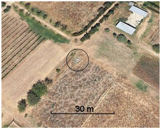 Figure 2. Google Earth image taken on 5 August 2012 over the Cascine site. The black circle indicates the position of the weather station and soil water content (SWC) probe.