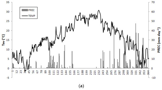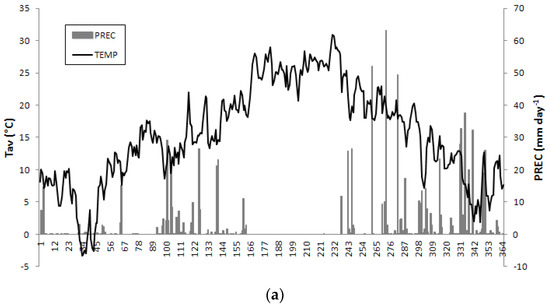 The daily evolution of mean air temperature and precipitation at Barbialla during 2012 is shown in Figure 3a. The annual precipitation is about 900 mm and is distributed with three maxima (i.e., in April, September, and December) and a minimum during summer. Summer is also characterized by mean air temperature close to 30 °C, leading to a prolonged dry season from the beginning of June to the end of August.