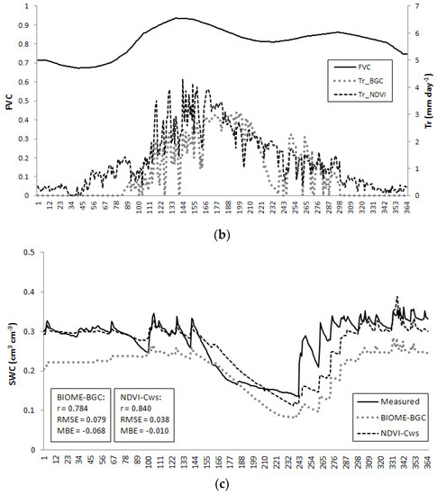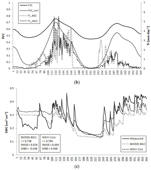 (a) Daily mean air temperature and precipitation interpolated for the Cascine site; (b) daily FVC (original and corrected) derived from NDVI and transpiration estimated by BIOME-BGC and NDVI-Cws; (c) daily SWC measured and estimated by the two modeling approaches. Errors are expressed in cm3 cm−3.