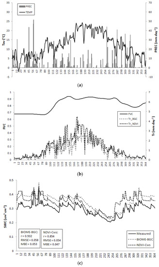 (a) Daily mean air temperature and precipitation interpolated for the Barbialla site; (b) daily fractional vegetation cover (FVC) derived from NDVI and transpiration estimated by BIOME-BGC and NDVI-Cws; (c) daily SWC measured and estimated by the two modeling approaches. Errors are given in cm3 cm−3.