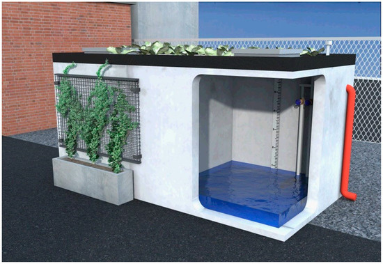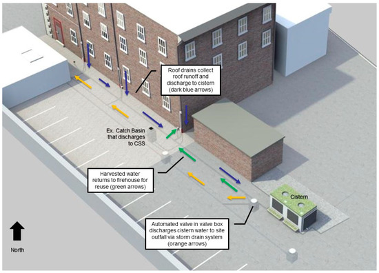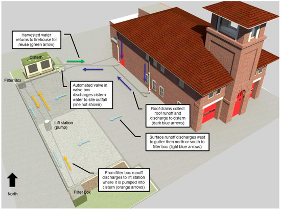 Stormwater runoff from the roof of Engine House 25 (approximately 112 m2 (1200 ft2)) was also redirected into an aboveground green tank cistern of the same combined storage capacity as Engine House 3 (14,970 L (3950 gal.)) and stored for on-site reuse. In addition to the roof area at Engine House 25, runoff from the entire parking area (approximately 455 m2 (4900 ft2)) was routed through two stone filter box systems and subsequently pumped to the cistern for reuse. Figure 2 provides a rendering of the cistern system installed at the study sites.