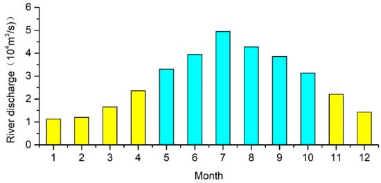 The Yangtze River is the longest river in China, with a total length of 6380 km. Its catchment area measures 1.8 × 106 km2. Its annual mean freshwater discharge of 27,856 m3/s was obtained using measurements recorded from 1957 to 2015 at the Datong hydrological station. The discharge has been observed to have obvious seasonal changes (Figure 2). During the dry seasons each year (November to April) the discharge averages approximately 16,542 m3/s. The construction of the Three Gorges Dam redistributed the annual discharge into the middle and lower reaches of the Yangtze River. The Three Gorges Dam was built in 1994 and completed in 2009. As of the end of September 2006, the flood control capacity of the Three Gorges Reservoir began to play a role in the flood seasons. Therefore, the distribution of the yearly discharge into the middle and lower reaches of the Yangtze River was determined to have changed after 2006 (Table 1).