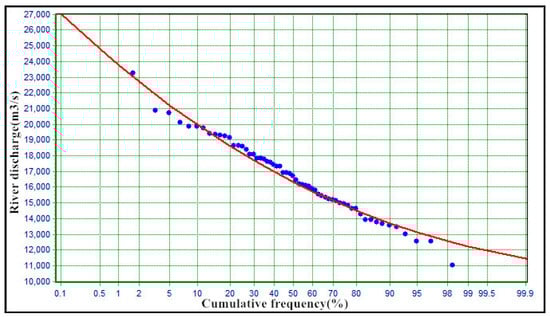 In this study, a Pearson III (P-III) frequency curve was used to analyze the monthly river discharges documented at the Datong station spanning from 1957 to 2015 []. The statistical analysis results obtained for the 25%, 50%, and 75% frequency of river discharges were 18,112, 16,331 and 14,832 m3/s, respectively, during the dry seasons (Figure 3). The multi-year average of the river discharges was approximately 27,856 m3/s during the dry seasons, where the fitting curve displayed a variation coefficient (Cv) of 0.13, and a deviation coefficient (Cs) of 0.65.