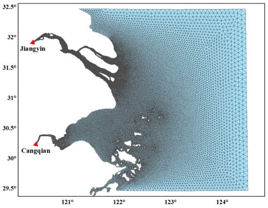 The space domain of the model was as follows: upstream to the Jiangyin Station in Jiangsu Province, at approximately 200 km away from the Xu River in the YRE. The offshore had three open boundaries in the south, north, and east, respectively. The spatial extent of the model was from 29.5° N to 32.5° N in the S–N direction, and from 120° E to 124.5° E in the W–E direction, with a total area of 93,185 km2. The topographical river data were measured. Then, the sea area data were digitalized to an underwater topographical sea chart. The computational domain was composed of an unstructured triangular mesh with 54,243 nodes and 92,771 elements. The largest mesh was located at the eastern ocean boundary, and the smallest was located in the North Passage. Generally speaking, the mesh size decreased from the open sea to the near shore (Figure 4). Then, based on the results of previous tests of mesh sensitivity, the differences in the physical factors were computed using mesh lengths from 200 to 8000 m.