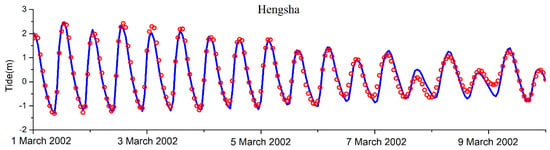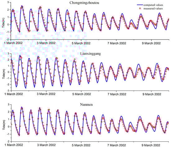 The computing time for model is from 00 a.m. 11 February 2002 to 00 a.m. 13 March 2002, which lasted for a month. The validation time of the model is from 00 a.m., 1 March 2002 to 00 a.m. 10 March 2002. In this paper, four tidal station data of Chongmingzhou (Cmz), Lianxinggang (Lxg), Nanmen (Nm), and Hengsha (Hs) are selected for tide level verification (Figure 5).
