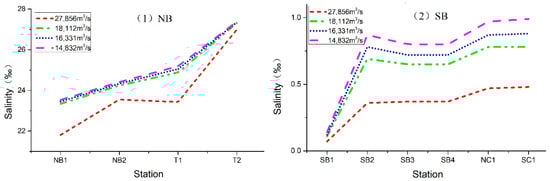 Table 3 and Figure 7(1) show the mean salinity level of the NB with the different river discharges. The overall salinity level of the NB was observed to be in a high state. It was also indicated that the river discharge decreased, while the mean salinity level was generally increased from the upper reaches of the NB to the offshore. Moreover, the amplification in the upper reach was found to be higher than that in the lower reach and offshore. The amplification at station T1 was greater than that at station NB2. This was determined to be due to the fact the salinity level at the NB2 was mainly subjected to the runoff of the NB, the flow spilt ratio of which was observed to be very small at less than 1% []. Meanwhile, the salinity level at station T1 was exposed not only to the runoff from the NB, but also the runoff from the SB.