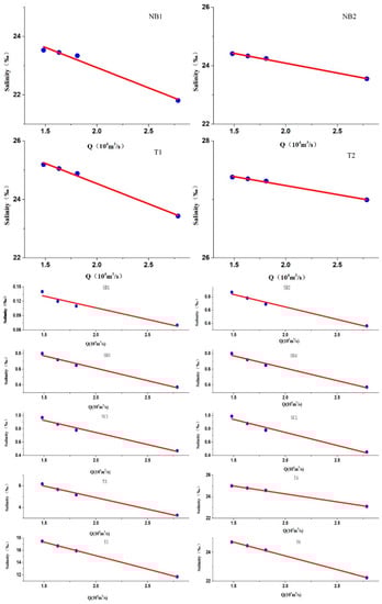 In order to determine the quantitative relationship between the river discharges and the salinity levels, the linear function (y = Ax + B) was used, as detailed in Figure 8 and Table 5.