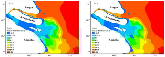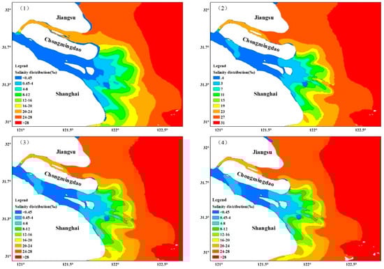 The space distribution of salinity in the spring tide: (1) Q = 27,856 m3/s; (2) Q = 18,112 m3/s; (3) Q = 16,331 m3/s; (4) Q = 14,832 m3/s.