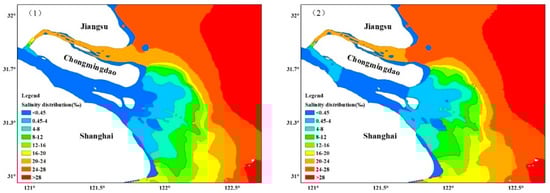 Figure 10 shows the trends of the salinity changes in the YRE and its offshore areas at the neap tide, which were similar to those detailed in Figure 8. Furthermore, under the same discharge conditions, the excess areas of salinity during the spring tide periods were larger than those during the neap tide. Since the tides are the driving force of the salt water intrusions, it was found that the more intense the tides, the more severe the salt water intrusions. It was also observed that when the runoff decreased, the saltwater became backcropped in the NB, which resulted in increased saltwater intrusions in downstream areas. The excess salinity areas in the upper reaches of the SB, as well as in the downstream sections of the area, continuously increased and expanded into the middle reach region.