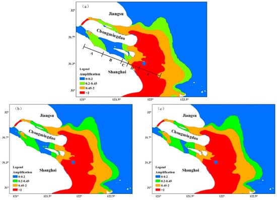 Differences of salinity level between different river discharges and multiyear river discharge in the dry season: (a) Q = 18,112 m3/s; (b) Q = 16,331 m3/s; (c) Q = 14,832 m3/s; A, B, C, D and E are the length of salinity amplification (unit: km).