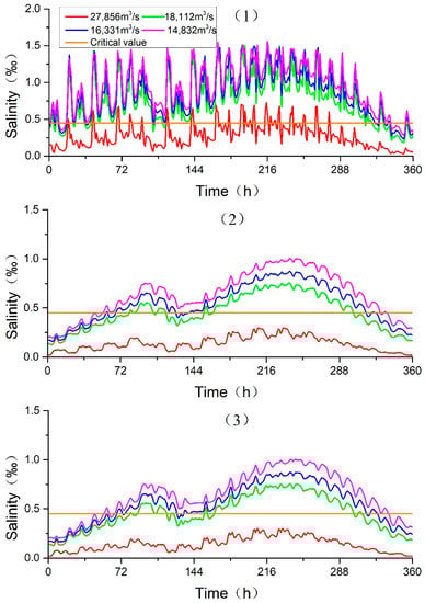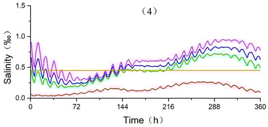 In the study, the salinity change process of four reservoirs under different flow rates through the model was simulated. Figure 12 shows that as the river discharges decreased, the salinity of the reservoir exceeded the standard. The changes in the salinity levels in the Dongfeng Xisha Reservoir displayed large fluctuations, and at times exceeded the standard. In comparison with the Dongfeng Xisha Reservoir major fluctuations, the salinity of the other reservoirs changed relatively slowly. When the river discharge was 27,856 m3/s, part of the Dongfeng Xisha Reservoir exceeded time limit. However, the salinity levels of the remaining three reservoirs were found to be below 0.45‰, and were not affected by the salt water intrusions. This was due to the fact that the Dongfeng Xisha Reservoir was located at the junction of the SB and NB. In this location, interactions occurred between the highly concentrated saltwater and the river water as it entered the sea. Therefore, the salinity levels fluctuated greatly.