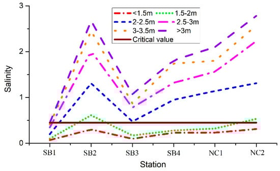 Table 10 and Figure 13 show that under the average river discharge of the dry seasons (16,542 m3/s) at Datong station, the mean salinity levels of the selected stations of the SB displayed different tidal ranges as follows: <1.5 m; 1.5 to 2 m; 2 to 2.5 m; 2.5 to 3 m; 3 to 3.5 m; and >3.5 m. It was observed that at the same rate of flow, as the tidal range increased, the salinity levels of each station continuously increased. From upstream to downstream along the SB, the stations generally showed rising trends. The salinity of the SB was found to be distributed as “high-low-high”. These results were consistent with those of the previous related studies.