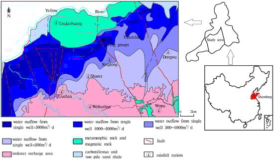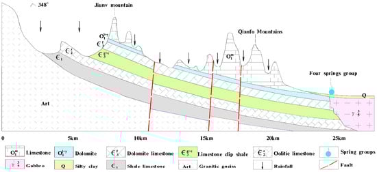 Jinan spring field is located in central and western Shandong Province. It has a warm temperate continental monsoon climate, an annual average temperature of 14.3 °C (1956–2013), and an average annual evaporation of 1500~1900 mm (1956–2013). Mean annual precipitation is around 676.94 mm (1956–2013), and the area has an uneven distribution of precipitation during the year, with about 73% of annual rainfall occurring from June to September. Jinan is located on the northern edge of the Shandong Mountains. The terrain is high in the south and low in the north, the south being the crystalline basement of the former Sinian gneisses. The Cambrian-Ordovician strata are exposed, ranging from old to new northwards, and the Yanshanian Magmatic rock is distributed in the north (Figure 1). The particular topography and geological structure in this area results in karst water in the southern mountain area to be recharged by atmospheric precipitation. The direction of movement of the karst water, the direction of the topography and the direction of the stratum are generally consistent, moving from the south to the north. As the karst water moves to the north, it is blocked by magmatic rocks. The groundwater becomes enriched at this point and, due to favorable terrain and geology, it reaches the surface as a spring (Figure 2). Atmospheric precipitation has been confirmed as the origin of the groundwater in the spring using isotopic analysis [46]. The dynamics of the groundwater level is affected by many factors, such as precipitation, artificial mining and local topography [6,47].