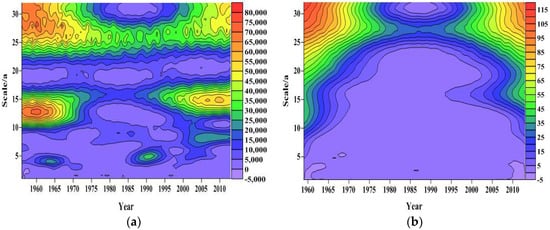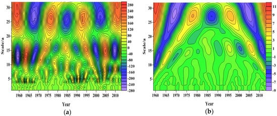 where Wf(a, b) is the wavelet transform coefficient; f(t) is a signal or square-integrable function; a is the scaling scale; b is the translation parameter; and is the complex conjugate function of . Most of the time-series data observed in geosciences are discrete, and the function is f(kΔt) (k = 1, 2, ..., N); Δt is the sampling interval. The discrete wavelet transform of Equation (1) was: