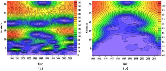 During the evolution of annual precipitation in the spring region, the maximum value of the time-scale was 25–32 years, and the most obvious change occurred during this time-scale, followed by the periodic changes in the 10–20 year time-scale. Periodic changes in other time-scales were smaller (Figure 5a). During the evolution of the spring water level during the spring period, the maximum value of the time-scale was 25–32 years, and the most obvious change occurred in this time-scale, followed by the periodic variation of 10–18 years (Figure 5b).