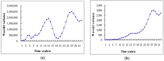 Wavelet variance plot. (a) For atmospheric precipitation; (b) for spring water level.