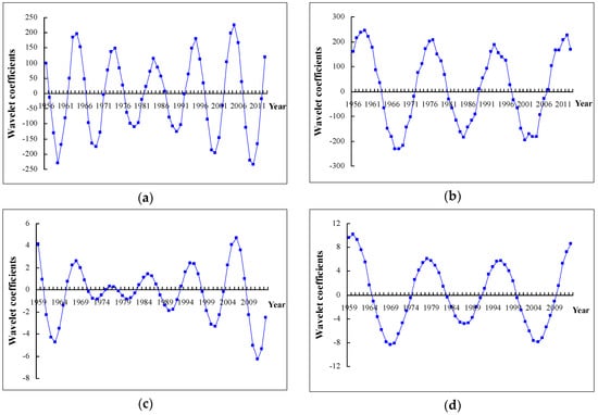 Wavelet coefficient main period chart. (a) 15-year scale for atmospheric precipitation; (b) 27-year scale for atmospheric precipitation; (c) 15-year scale for spring water level; (d) 27-year scale for spring water level.