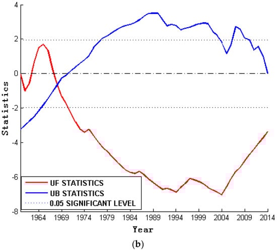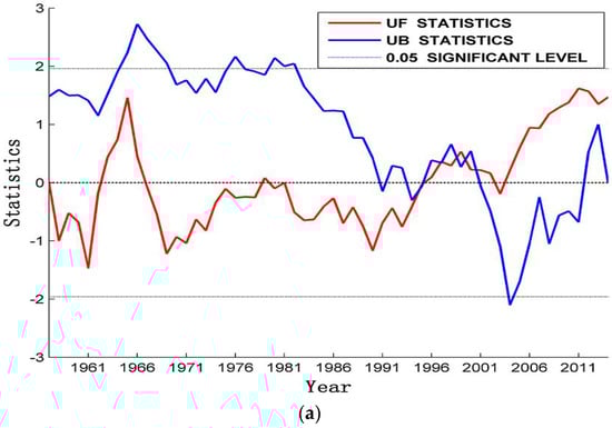 UFi is a standard normal distribution, which is a sequence calculated according to time series x order x1, x2, …, xn. Given a significance level a, in comparison with the data in the known normal distribution table, and if UFi > Ua, then significant changes exist in the trend. This method can also be applied to the inverse sequence of the time series, and the above procedure can be repeated by xn, xn−1, …, x1, thus making UFk = −UBk, k = n, n − 1, …, UB = 0. Given the significance level α, the two curves of UFk and UBk and the significant horizontal line are plotted on the same graph. If the values of UFk and UBk are greater than 0, then the sequence shows an upward trend; values below 0 indicate a downward trend. When the value exceeds the critical line, this indicates that the rising or falling trend is significant. The range beyond the critical line is defined as the time zone of mutation. If the UFk and UBk curves appear on an intersection point, and the intersection point is between the critical line, then the intersection point corresponds to the time the mutation begins. More detailed descriptions of this method are introduced in Reference [51].