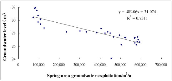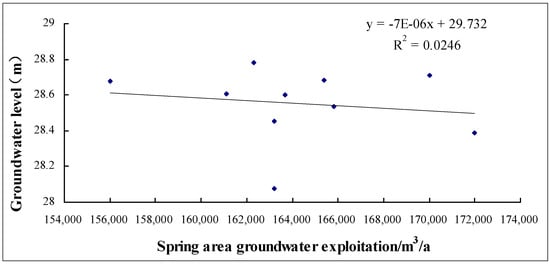 Before artificial recharge, a good correlation existed between the spring water level and extraction volume [53]. As the amount of extraction increased, the spring water level showed a downward trend (Figure 10). In order to restore the flowing state of the spring, the amount of groundwater exploitation was reduced and water recharge was undertaken in 2003. These remedial measures resulted in the correlation between spring water level and groundwater exploitation being significantly reduced (Figure 11). It can be presumed that if groundwater exploitation is small and stable, it can no longer be considered as the main factor affecting the spring water level changes. Zhang [47] also highlighted that the relationship between groundwater level and the amount of exploitation has not been significant since 1990.