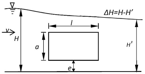 The hydrodynamic parameter schemes are detailed in Figure 1. In this figure, l is the length of the orifice-weir, m; a is the height of the orifice-weir, m; H’ is the downstream water depth, m; and ΔH is the water level difference, m, ΔH = H − H’.