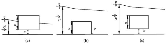 Figure 2b shows the weir flow situation, and Equation (2), , is the discharge formula for weir flow. If the e is very small, and the upstream level H >> e + a; thus, the discharge through the orifice can be approximately neglected and the flow pattern is similar to weir flow.