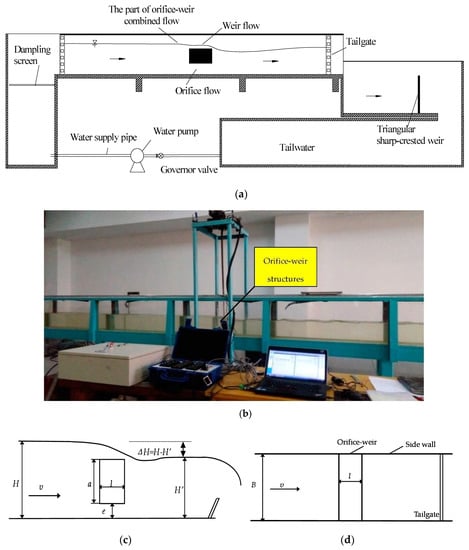 The experiments were carried out in a flume at the Hydraulic Laboratory, Hohai University. These experiments were conducted in a rectangular channel that was 0.5 m deep, 0.3 m wide, and 10 m long. The channel was supported by a platform 1.0 m above the floor and the slope of the flume was 0. The experimental rig was a self-circulation system, composed of a water pump, control valve, damping screen, glass flume, tailgate, triangular sharp-crested weir, and tailwater. Figure 3 shows the layout and a sketch of the experimental rig. A damping screen was installed upstream of the flume to calm the flow. The testing area for the combined orifice-weir flow was in the center of the flume. The width of the orifice-weir structure is the same as the width of the channel; that is, the contraction coefficient is 1. The water flows through the upper and lower parts of the structure to the downstream area. The tailgate was located at the end to regulate the water level. The water supply to the flume was provided through the supply pipe with a valve that controlled the flow. The discharge was measured at a triangular sharp-crested weir at the end of the flume. The water level was measured upstream and downstream in all experimental runs by a point gauge with an accuracy of ±0.01 cm. The experiments were conducted under conditions of steady flow and submerged flow. The tailgate affected the upstream depth and consequent discharge, and the typical velocities were obtained by particle image velocimetry (PIV). The flow characteristics around the orifice-weir structure were measured along the longitudinal section.