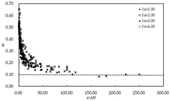 The m values are plotted against e/ΔH for different values of l/a in Figure 5. In particular, the combined orifice-weir flow with e/ΔH < 10 results in higher m values. Compared with a classic broad-crested weir and a waterways experiment station (WES) weir, which are commonly used in water conservancy projects as discharge weirs, the discharge area of the combined orifice-weir is larger for a given weir height under submerged conditions. A negative power-function relationship exists between m and e/ΔH, and the values of l/a have little effect on the m values. The value of m decreases significantly with a slight increase in e/ΔH values if e/ΔH < 100. The effect of small ΔH values on m is evident. A larger ΔH value is required to obtain a high m value in actual situations. As shown in Figure 4, the range of m decreases as the value of e/ΔH increases, and the value of m gradually stabilizes at high values of e/ΔH. If m is close to 0.1, the discharge coefficient values tend to plot along a horizontal line, which means that e/ΔH has no significant effect on m.
