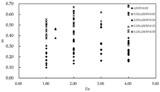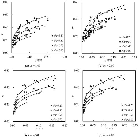 The relationships between m values and ΔH/H values for different values of the ratios e/a and l/a are compared in Figure 7. A greater value of ΔH/H significantly increases m for the same e/a, and with a smaller ΔH/H, the gradient of m becomes larger. The change in m becomes obvious if ΔH/H approaches 0. A larger ΔH is required to obtain a high value of m in actual situations, which is similar to previously discussed trends. There is a limiting effect on the discharge capacity and this limited discharge capacity produces a higher water level upstream of the orifice-weir region. A high downstream water depth results in a small water level and high submergence, leading to a lower discharge capacity. ΔH/H exhibits a nonlinear power function relationship in all cases. The effect of e/a on m is different for the same ΔH/H value among the orifice-weir lengths. For the same value of ΔH/H, a lower value of e/a results in a higher value of m. Additionally, a comparison of the values of m for different values of l/a reveals that different l/a values have little effect on the range of m values.