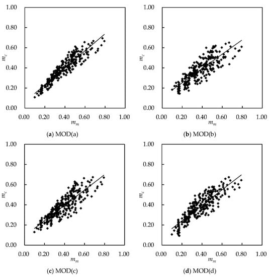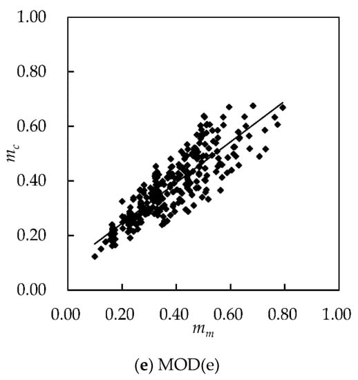 In Table 1, the values of the AMCC, RMSE, and MAPE are provided for the four models to compare the obtained m values. MOD(a) shows the best performance among the models, and the AMCC, RMSE, and MAPE values are 0.870, 0.053, and 0.058, respectively. The AMCC values of MOD(c) and MOD(d) are 0.756 and 0.762, respectively. The AMCC value of MOD(b) is 0.705, which corresponds to the lowest accuracy in the prediction of m. In addition, the indices in Table 1 are presented to highlight the sensitivity of the calculation to the parameters. The AMCC of MOD(d) is larger than that of MOD(b), which means that has a clear effect on the estimation of m, whereas l/a does not. In terms of sensitivity, the parameters can be arranged as follows: