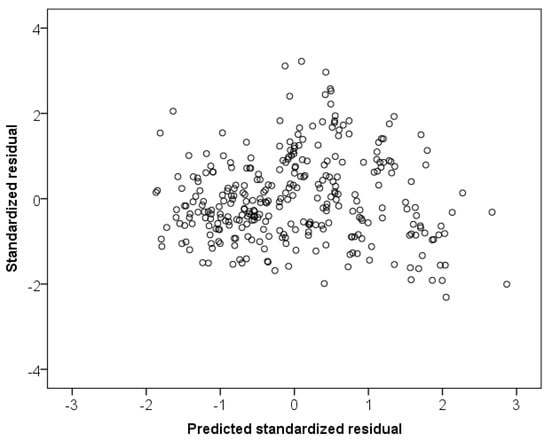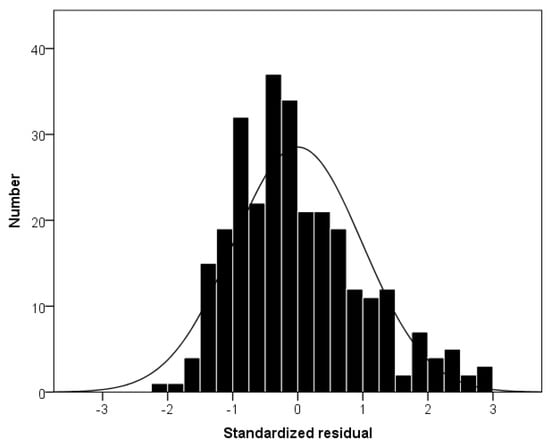 Figure 9 shows the distribution of the residuals of MOD(a) via a histogram of the residuals with a normal probability curve. As shown, the residuals present a normal distribution. The 95% distribution of the standardized residual data is between −2 and +2, which proves that the model assumptions are reasonable. Figure 10 shows a scatter plot of the standardized residual data.