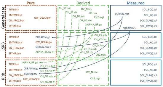 Parameters derived from measurements or observations either through relationships, calculations or lookup tables are defined as derived parameters. These parameters theoretically contain three types of uncertainties: (i) with respect to their literature definition (based on experimental data), (ii) the uncertainties of the measured data used to specify, and (iii) the selection made by the user for the specific problem, which can depend on user expertise. These parameters are often supported by extensive surveys or research that has been generalized in a way that is well accepted within the community, if not without uncertainties. For example, CN2 is commonly adjusted in SWAT to reduce mismatch between modeled and observed streamflow. Even though specification of CN2 can be subjective to certain extent, the variability of these values has a consensus in the literature and a sound scientific basis. Therefore, we can be more certain about them than pure calibration parameters [58,59]. Other examples of derived parameters include Manning’s roughness coefficients for tributary and main channels (CH_N1 and CH_N2) and others shown in Figure 2.