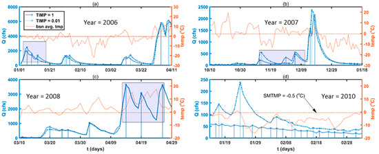 Changes in streamflow at MN 66 gage (gage 8 in Figure 1) from the LSRB model is used to illustrate analysis in the time domain. The blue box in Figure 3a,b highlights time periods (years 2006 and 2007, respectively), where significant offsets between streamflow for the scenario with TIMP = 1 and TIMP = 0.01 can be observed. Results demonstrate that TIMP is sensitive when the air temperature persists in sub-zero temperatures. The sensitivity is most clearly seen in the year 2010, when temperatures persisted below zero for nearly a month and a half (Figure 3d). When temperature rises above zero, the parameter has no effect in the outcome as can be seen for the year 2008 (See Figure 3c blue box). Multiple years are shown instead of just one to illustrate that the behavior is not a random occurrence. Scrutinizing the effects of TIMP in this way allows us to better understand its influence on the magnitude, as well as the timing of streamflow.