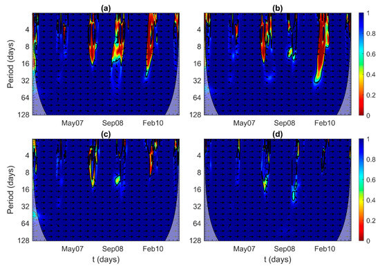 Comparing model performance using the magnitude squared coherence approach compares all frequencies present in the signal; however, it cannot localize the mismatch in time. This results in the loss of time information [75]. Moreover, the global nature of lumped error metrics (e.g., NSE, R2) is of little use when event scale predictions or time resolution of model performance is needed. Instead, coherence calculated using wavelets can provide this information. Specifically, the time-frequency representation of measured and simulated signals allows us to clearly see (1) if there are any patterns in the model’s inability to simulate observed flows, and (2) the times and frequencies for which the model was able to capture the measured streamflow. In Figure 7a,c, the residuals show the time periods when there are differences between the measured and predicted streamflow. This time domain view provides insights into the time and magnitude of discrepancies. In Figure 7b, the wavelet coherence plot shows that frequencies below the 32-day band are generally not captured well, except for a few locations. Beyond the 32-day band, we see a nearly 100% capture of the measured signal by the model. In Figure 7d, we see mismatches up to the 128-day band during certain time periods. However, there are time periods when the higher frequencies are captured well by the model.