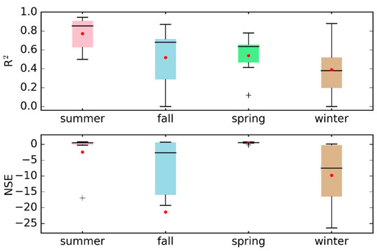 Seasonal NSE and R2 for the Root River Basin for the calibration period. Average overall NSE and R2 for the calibration period are 0.69 and 0.70, respectively. The box and whisker plot shows the eight number summary of the performance metrics. The height of the box portion is given by the interquartile range (IQR, 25th to 75th percentile) of the performance metrics NSE and R2. The horizontal bar is the median, red dot is the mean and the whiskers represent the 10th and 90th percentile values. The extreme values are shown with a “+”.