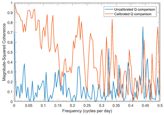 Magnitude squared coherence via Welch comparing measured streamflow with uncalibrated and calibrated streamflow. A value of 1 indicates the frequency is present in both the measured and predicted signals and a zero means it was present in one and not the other.