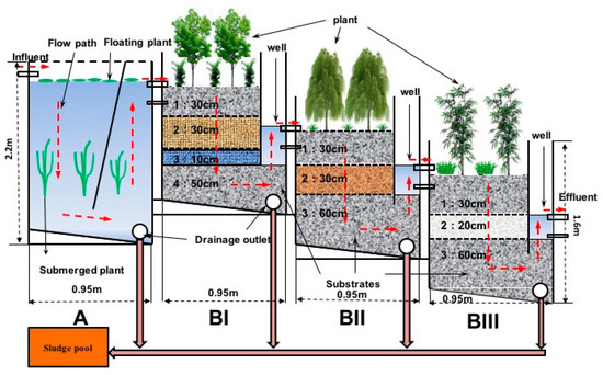 The above Reactions (1)–(5) provide a theoretical background for the design of a wetland treatment process following the pollutant transformation pathway. As illustrated in Figure 1, the presented rural household system consists of four basic units with a surface-flow wetland cell A, used as the first treatment unit that allows sedimentation and precipitation of large pollutant particles, connected in series with three vertical subsurface-flow wetland cells, BI, BII and BIII. Following the reaction pathway, the major target pollutants to be removed by use of different plant species and adsorbents in units A, BI, BII and BIII, are organic (e.g., amino acids), cationic (NH4+) and anionic (NO3−, PO43−) pollutants, respectively. The drainage outlet of each treatment cell is connected to a sludge pool (Figure 1), which allows discharge of sludge from the drainage outlets of the system when needed. In addition, the drainage system is designed to prevent clogging that will be inevitably encountered in constructed wetland systems after a long period of operation.