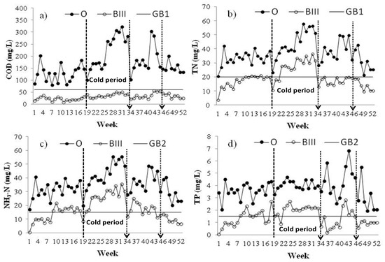 The high difference in temperature between the cold and warm periods did not cause significant changes in the effluent concentration of CODCr. Despite the sharp increase in initial pollutant loadings in the cold period, the concentration of CODCr (as well as BOD5 and TSS) in the effluent of BIII remained below the GB1 (the stricter first B discharge standard) line throughout the operation period (Figure 2a). In comparison, the negative impact of the pollutant loadings on the removal of TN (Figure 2b), NH3-N (Figure 2c) and TP (Figure 2d) was apparently exaggerated by the low temperature in the cold period, which raised the effluent concentrations of these three pollutants to significantly higher levels than their discharge standards. There were clear trends of increasing pollutant concentrations in the effluent of BIII under increasing operation time before the day when the first sludge drainage was performed (Figure 2). The increasing trends of the effluent concentrations were indications of pollutant accumulation in the solid phase of the system. As shown in Figure 2, the discharge of the sludge using the drainage pipelines (Figure 1) to empty the stored wastewater from the whole system for 24 h was carried out twice (week 34, the end of the cold period, and week 45, the end of the spring) in the later operation period. The effect of sludge discharge with the purpose of removing the accumulated pollutants was effective as it resulted in a significant reduction of the effluent concentration for all analyzed pollutants in all treatment cells. The observed differences between the month before and after the sludge drainage showed that the sludge discharge enhanced the average monthly removal rates by 16.8%, 20.1% and 34.6% at week 34, and 8.2%, 11.5% and 16.2% at week 45 for TN, NH3-N and TP, respectively. The sludge discharge measure was shown to be effective to reduce the effluent concentrations of NH3-N and particularly TP to meet the designed discharge standards.