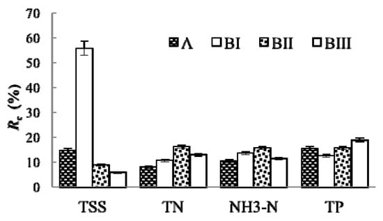 The highest Rc value of TSS obtained at BI indicated that the subsurface-flow wetland cell was an excellent sedimentation and filtration system for removal of suspended solids. Unlike the Rr value of CODCr (Table 5), which increased from A to BIII due to a decrease in denominator Cin, the Rc value of CODCr decreased along the treatment pathway (Figure 3). The highest contribution rate for CODCr was obtained in cell A because, as the first unit, it received the highest pollutant loads. As expected, BII (designed for removal of cationic pollutants) had the highest contribution for the removal of TN and NH3-N while BIII (designed for removal of anionic pollutants) had the highest contribution for the removal of TP. The difference in contribution rates between cells was significant (p < 0.001) for all analyzed pollutants.