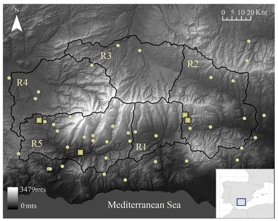 Location of the Sierra Nevada Mountain Range in Spain. The weather station network used in this study for measuring precipitation (yellow circle) and temperature (yellow square), and the limits of the five regions into which the study area was divided for the spatial analysis: Adra (R1), Andarax (R2), Fardes (R3), Genil (R4), and Guadalfeo (R5).