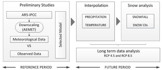 Figure 2 shows the scheme followed in assessing the impacts of future climate scenarios on the snow regime. Information was available regarding the reference values of the climate variables analyzed in this study during the reference period 1961–2000 from previous works [12,31], on both annual and decadal scales.