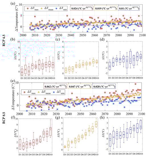 Evolution of the (a,e) annual mean, maximum, and minimum daily temperature anomalies and decadal (b,f) maximum, (c,g) mean, and (d,h) minimum temperature anomalies for the two climate change scenarios analyzed, respectively, during the period of 2006–2100. The trend analysis results are defined according to the Mann-Kendall test as having either (1) excellent significance, 99% (***); (2) good significance, 95% (**); (3) acceptable significance, >90% (*); and (4) no significance, less than 90% (+).