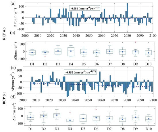Evolution of the (a,c) annual and (b,d) decadal mean annual precipitation anomalies for the two global change scenarios analyzed for RCPs 4.5 and 8.5, respectively, during the 2006–2010 period. The trend analysis results are defined according to the Mann-Kendall test as having either (1) excellent significance, 99% (***); (2) good significance, 95% (**); (3) acceptable significance, >90% (*); and (4) no significance, less than 90% (+).