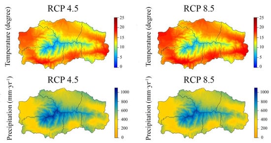 Precipitation and temperature data series were provided by the Spanish Meteorological Agency (AEMET) in specific locations across the study area for the reference (1961–2000) and future (2006–2100) periods. Four different representative concentration pathways (RCPs) were available in the framework of the Fifth Assessment Report of the Intergovernmental Panel for Climate Change [14], which assesses different levels of greenhouse gas emissions in future years. For this study, two of these scenarios were chosen: an intermediate mitigation scenario (RCP 4.5), which assumes an emission reduction from 2050 onwards, and a high emission trajectory (RCP 8.5), which contemplates the possibility of not reducing emissions.