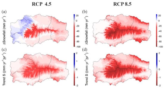 Based on the previous results, daily snowfall occurrence was estimated for each scenario on a 30 × 30 m grid, as described in Section 2. In this work, the results were aggregated on the annual and decadal scales and averaged over the different spatial units in this work. Figure 6 shows the spatial distribution of the anomalies of the mean annual snowfall in the study area during the future period under both climate scenarios in this work, together with the mean annual trends during the study period. The largest impacts can be found in the highest areas (i.e., mostly negative anomalies), being both larger and more extended in RCP 8.5, as expected. Only under RCP 4.5 did some areas in the west side of the Sierra Nevada basins exhibit positive anomalies, although these were much lower in absolute values than the negative ones. Trends are negative in all cases, and they are higher in the snow domain area.