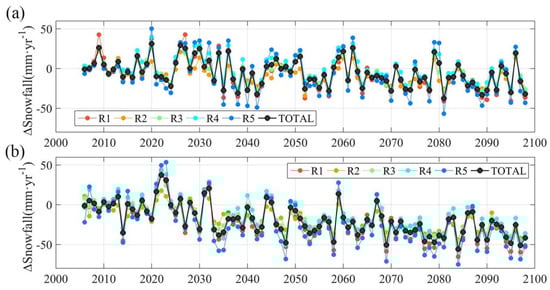 Annual evolution of the annual snowfall anomalies during the future study period of 2000–2100 for (a) RCP 4.5 and (b) RCP 8.5, averaged over each region in Sierra Nevada (Figure 1) and the whole study area.
