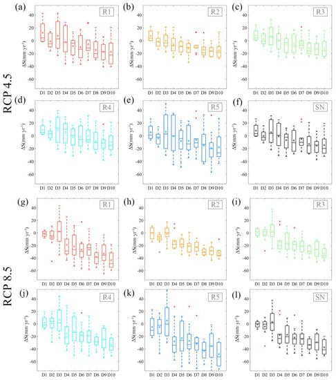 Decadal evolution of the mean annual snowfall anomalies during the study period in Sierra Nevada for RCP 4.5: (a) Region 1, (b) Region 2, (c) Region 3, (d) Region 4, (e) Region 5, and (f) the total study area, and the decadal evolution for RCP 8.5: (g) Region 1, (h) Region 2, (i) Region 3, (j) Region 4, (k) Region 5, and (l) the total study area.