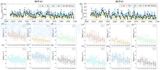 Annual evolution of the annual snowfall days indicator (Dsnowfall) during the 2006–2100 future study period for (a) RCP 4.5 and (h) RCP 8.5, averaged over each region in Sierra Nevada (Figure 1) and the whole study area. Decadal evolution of the mean annual snowfall anomalies during the study period in Sierra Nevada for RCP 4.5: (b) Region 1, (c) Region 2, (d) Region 3, (e) Region 4, (f) Region 5, and (g) the total study area, and the decadal evolution for RCP 8.5: (i) Region 1, (j) Region 2, (k) Region 3,(l) Region 4, (m) Region 5, and (n) the total study area.