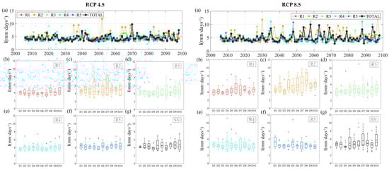 Regarding Isnowfall (Figure10), this indicator shows similar values in most of the identified regions in Sierra Nevada, with the exception of R2 and R3, which exhibit more torrential behavior. As previously stated, these regions represent the semiarid conditions in Sierra Nevada, and their features tend to be enhanced in the future climate scenarios, especially under RCP 8.5, as expected. All resulting trends are positive (RCP 4.5: 0.006 (mm·days−1)·year−1 and RCP 8.5: 0.01 (mm·days−1)·year−1), although quite moderate under RCP 4.5. The decadal scale more clearly confirms the semiarid character of R2, with high variability, as well as the snow-dominated regime in R5.